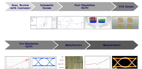PCB 설계 전 단계에서 Signal Integrity(SI) 및 Power Integrity(PI) 시뮬레이션을 수행하여 잠재적인 신호/전원 문제를 사전에 검증합니다.