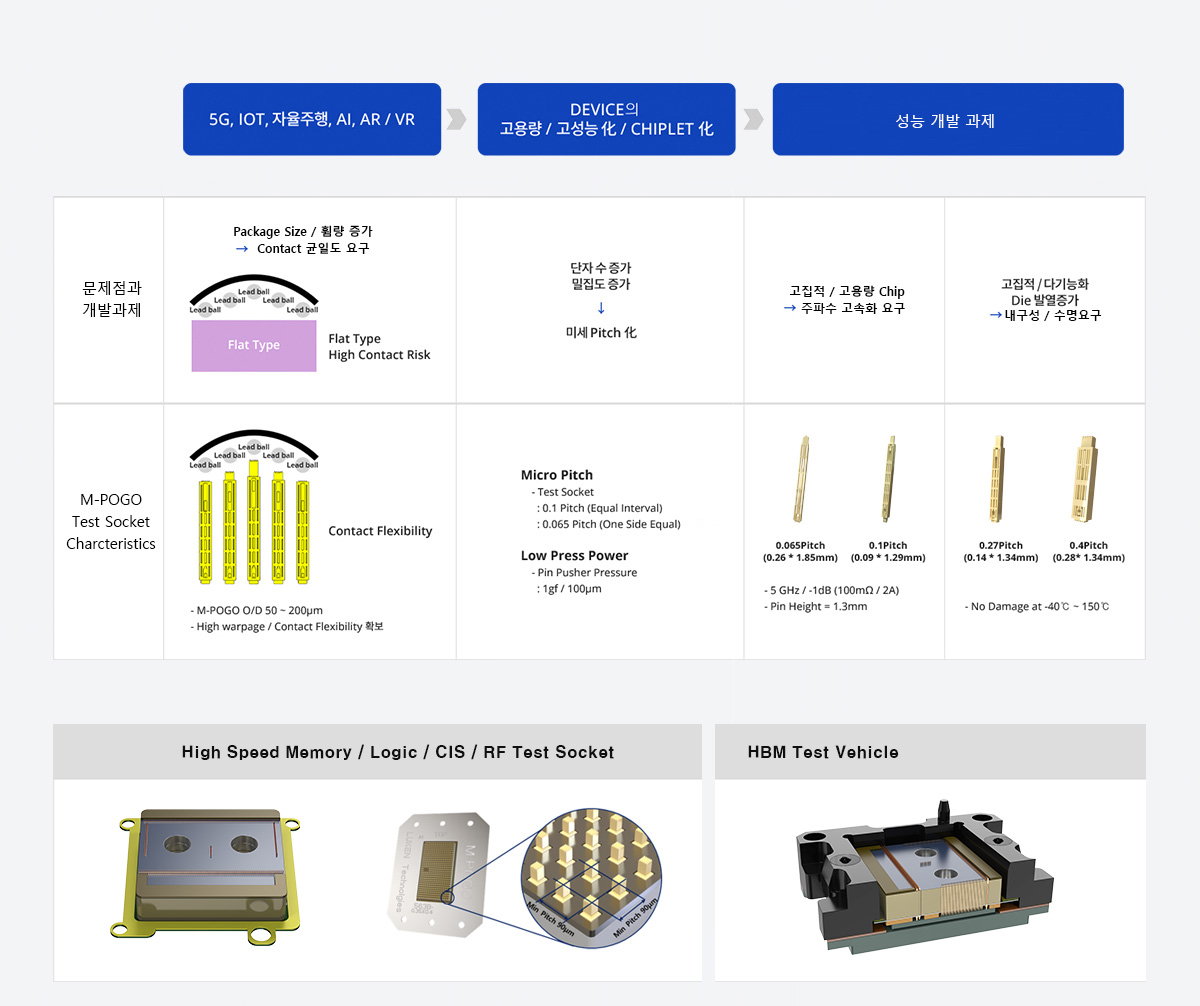 5G, 자율주행, Iot, AI, VR 등 4차 산업분야의 기술 발달로 고집적, 고용량 반도체 패키지의 고주파수 요구 성능이 확보된 M-POGO Test Socket을 제공합니다.